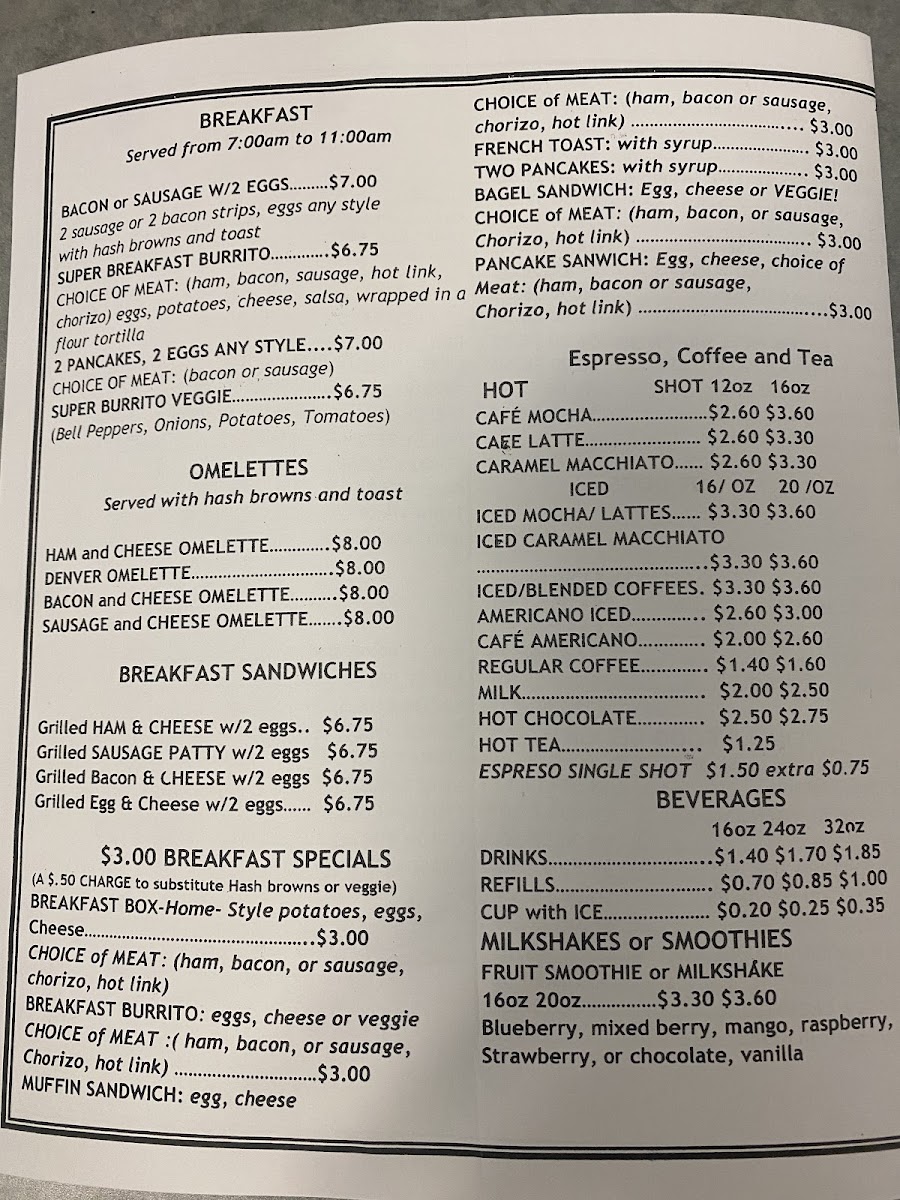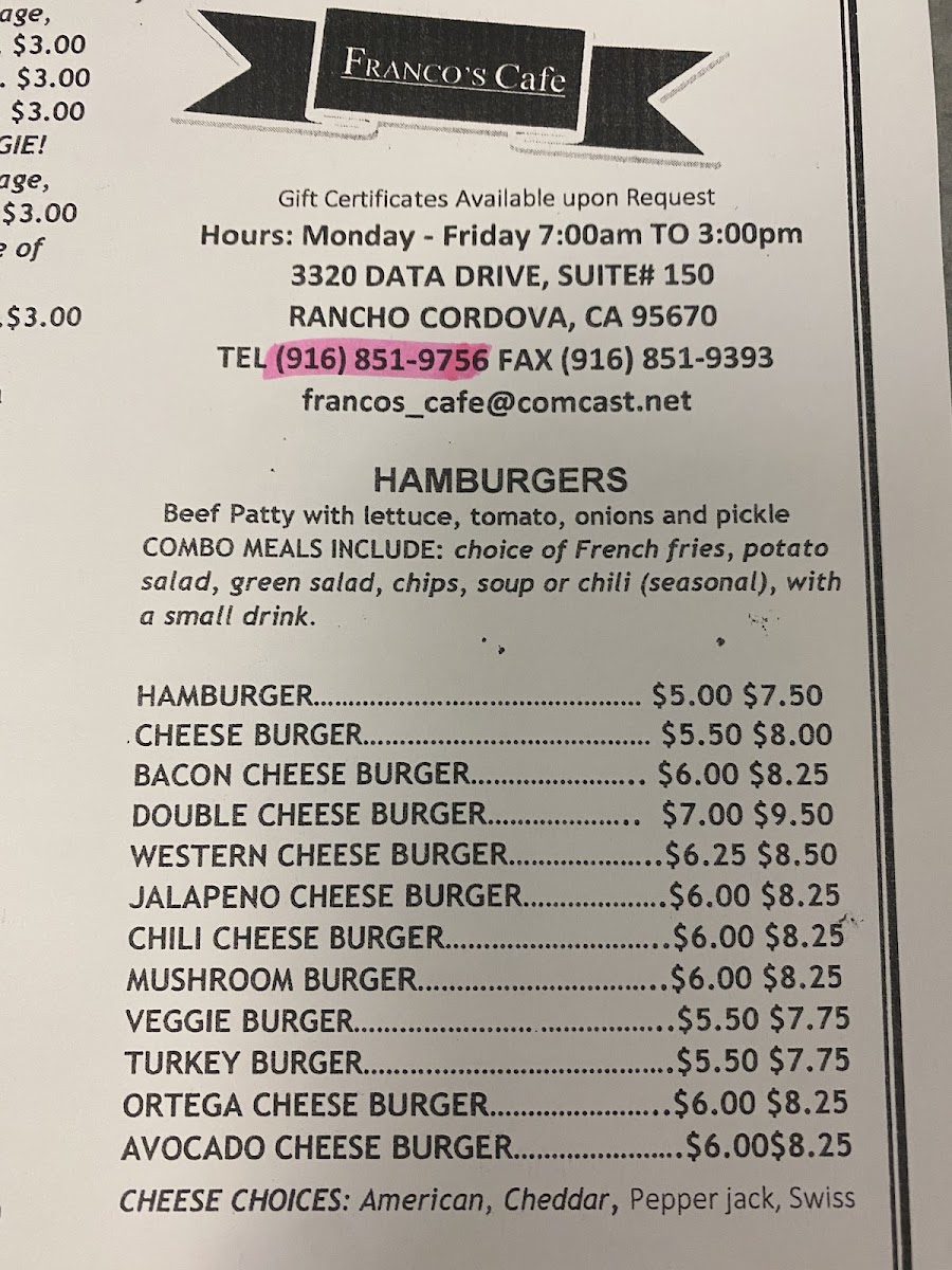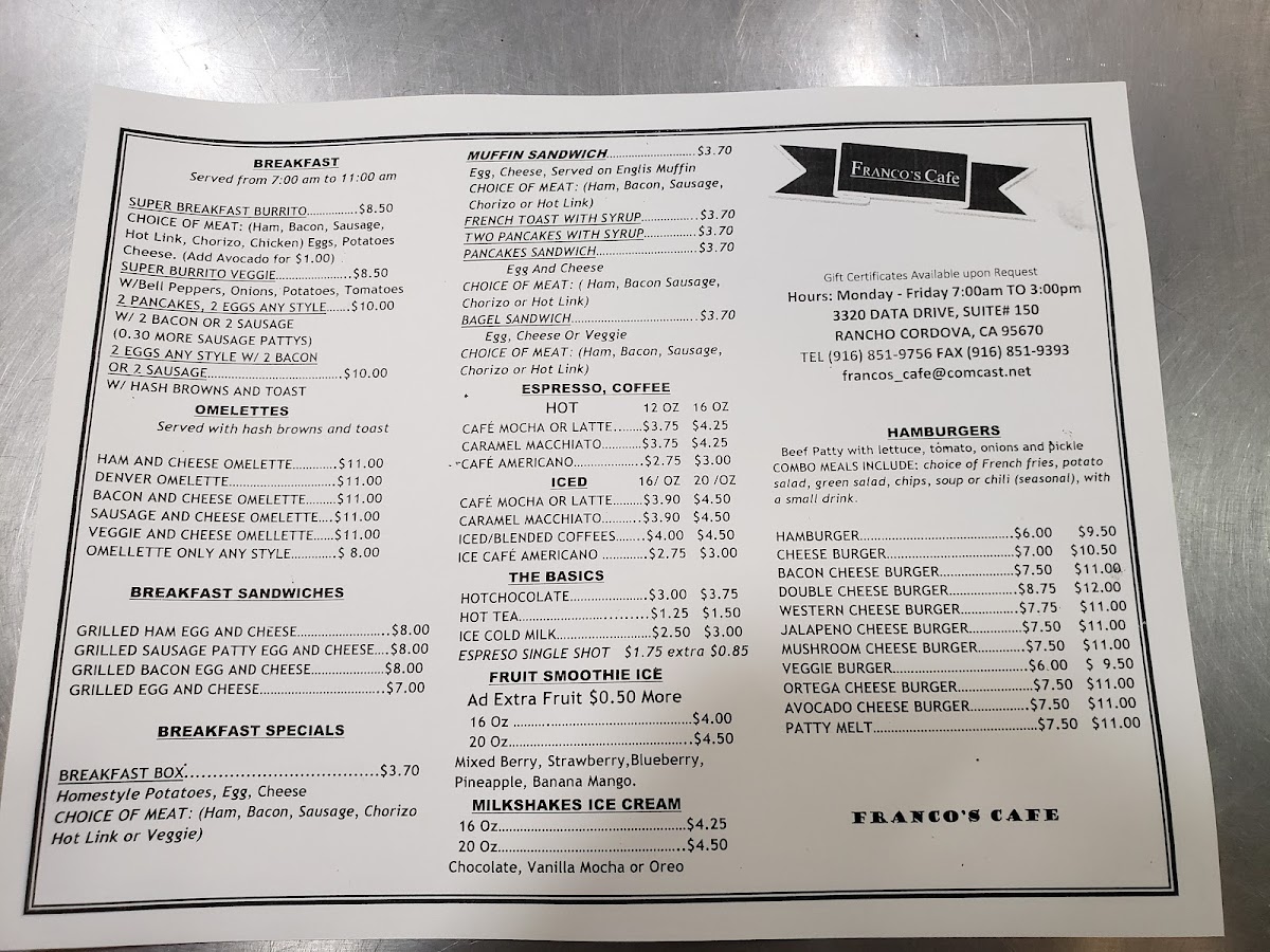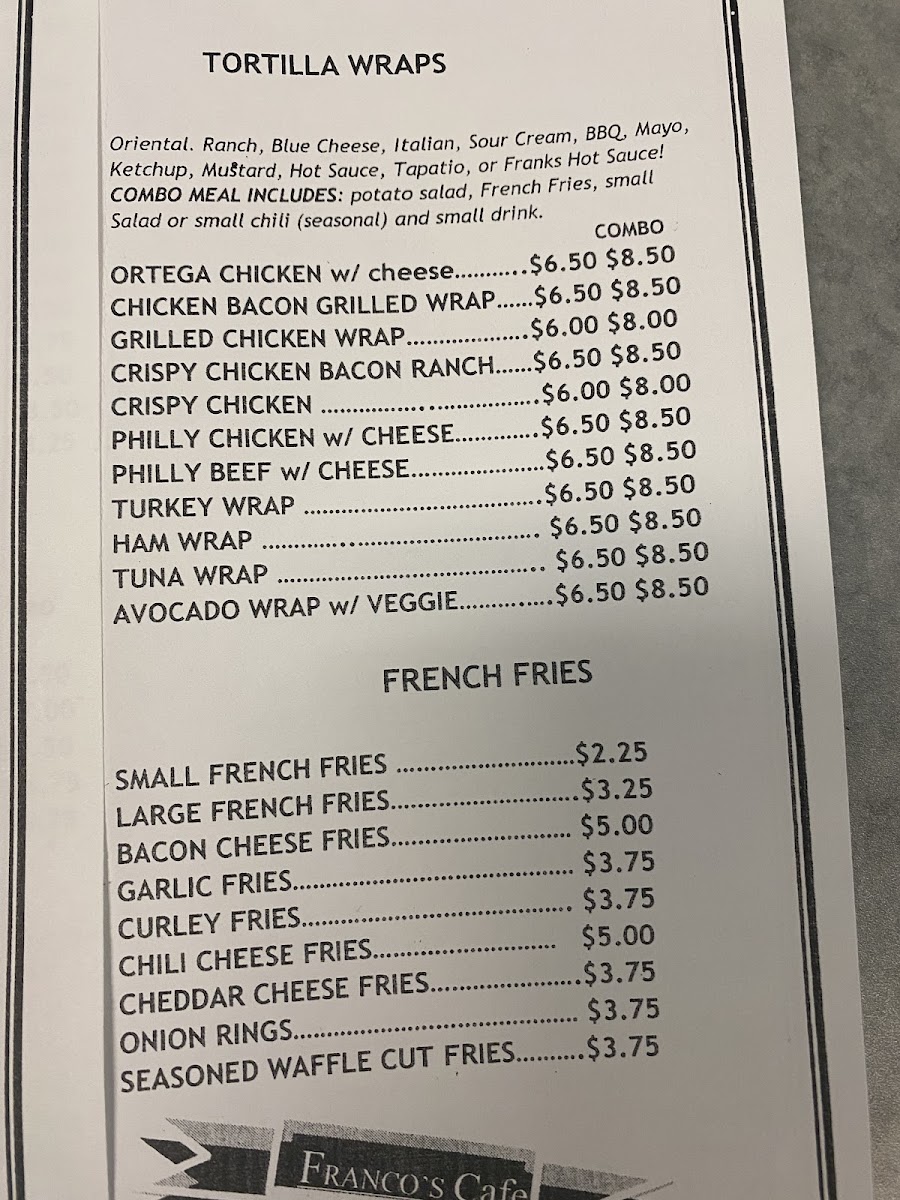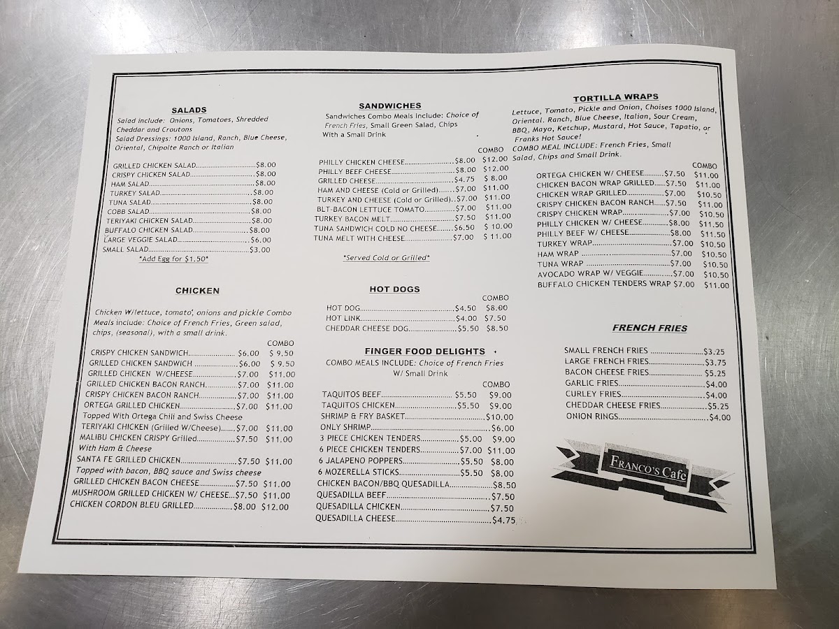 From a reviewer’s perspective, Franco’s Cafe offers a broad, satisfying menu that covers everything from hearty breakfasts to classic American comfort food. The salad selection, including Grilled Chicken Salad, Crispy Chicken Salad, Ham Salad, Turkey Salad, and Tuna Salad, provides lighter options, while the chicken section features favorites like the Crispy Chicken Sandwich, Grilled Chicken Sandwich, and Grilled Chicken Bacon Ranch. Sandwich lovers can enjoy options such as the Philly Chicken Cheese, Philly Beef Cheese, and Turkey Bacon Melt, while quick bites like Hot Dog, Hot Link, and Cheddar Cheese Dog are great for a simple meal. The breakfast menu is especially appealing with items like the Super Breakfast Burrito, 2 Pancakes, and omelets such as the Denver Omelette and Bacon And Cheese Omelette. With sides like Bacon Cheese Fries, Garlic Fries, and burgers like the Western Cheese Burger and Double Cheese Burger, the menu overall feels diverse, filling, and well-suited for a casual, affordable dining experience.